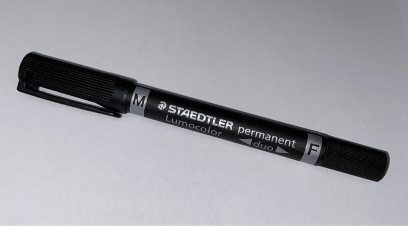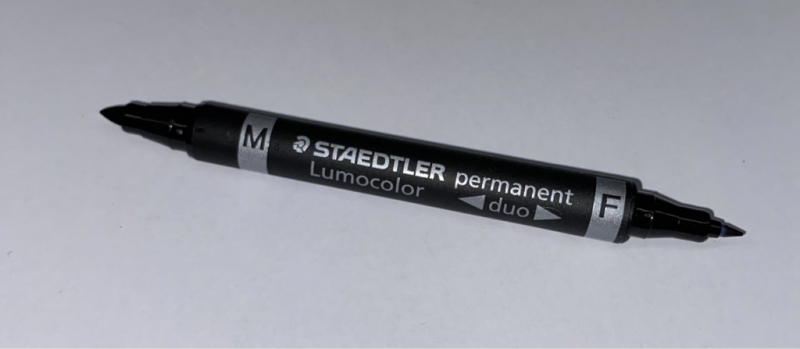 Dieser Permanentmarker Lumocolor Duo hat zwei Enden. Mit der einen Seite schreibt er dick und mit der anderen ganz dünn wie ein Fineliner. Er ist UV beständig und nicht abwaschbar. Er eigent super für dauerhafte Beschriftungen von Etiketten.