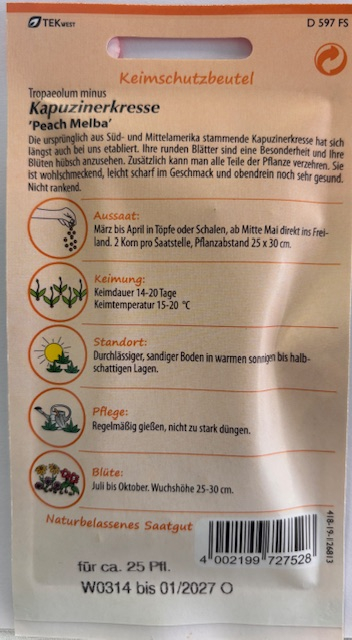 Diese niedrige Kapuzinerkresse mit den leuchtend gelben Blüten erreicht eine Wuchshöhe von ca. 30 cm.Man kann alle Teile der Pflanze verzehren, sie hat einen angenehmen senfschafen Geschmack.