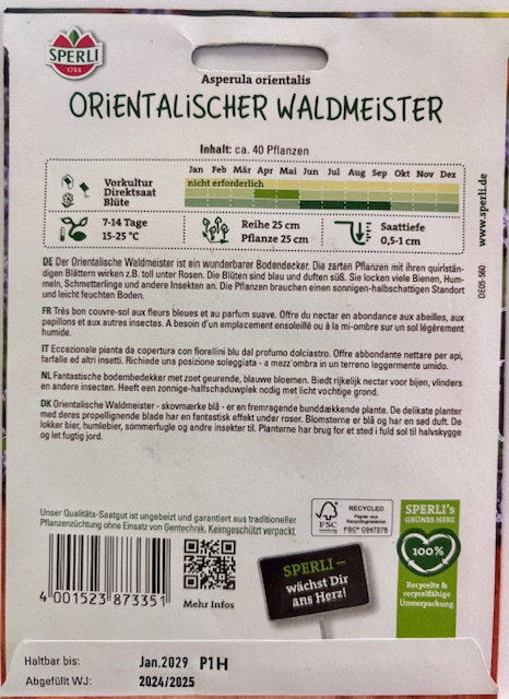Der Orientalische Waldmeister ist ein wunderbarer Bodendecker. Die zarte Pflanze mit ihren quirlständigen Blättern wirkt toll unter Rosen. Die Blüten sind blau und duften süß. Sie locken viele Bienen, Hummeln, Schmetterlinge und andere Insekten an. Die Pflanzen brauchen einen halbschattigen Standort und feuchten Boden.Aussaat ab April im Freiland