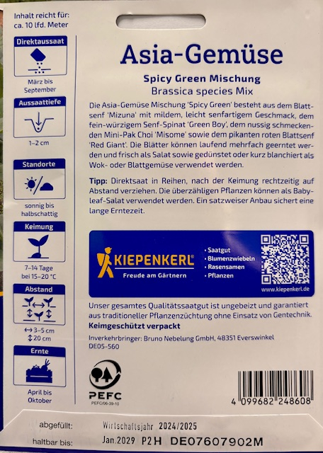 Die Asia-Gemüse Mischung 'Spicy Green' bietet eine bunte Auswahl an geschmacklichen Höhepunkten. Sie vereint den milden Blattsenf 'Mizuna', den würzigen Senf-Spinat 'Green Boy', den nussigen Mini-Pak Choi 'Misome' und den pikanteren roten Blattsenf 'Red Giant'. Diese Mischung ermöglicht eine ständige Mehrfachernte, sodass Sie jederzeit frische Zutaten zur Verfügung haben. Die Blätter können sowohl frisch als auch gedünstet verwendet werden und bringen asiatischen Flair in Ihre Küche. Ob in Wokgerichten oder in Salaten – diese Mischung bereichert Ihre Mahlzeiten nicht nur geschmacklich, sondern auch optisch. Entdecken Sie die Vielfalt der Asia-Gemüse Mischung 'Spicy Green' und genießen Sie asiatische Frische direkt aus Ihrem Garten!Aussaat ab März - September