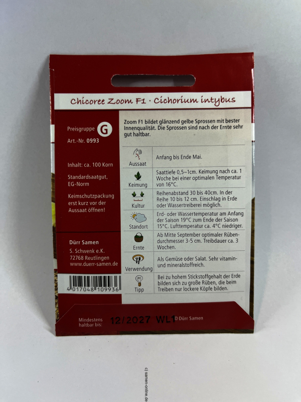 Ernte: Ab Mitte September optimaler Rübendurchmesser 3-5 cm. Treibdauer ca. 3 Wochen.