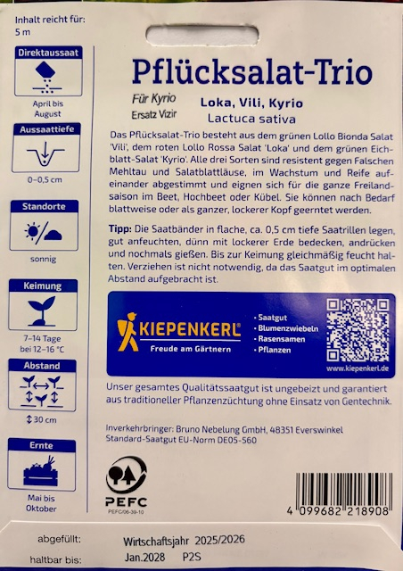 Das Pflücksalat-Trio besteht aus dem grünen Lollo Bionda Salat 'Vili', dem roten Lollo Rossa Salat 'Loka' und dem grünen Eichblatt-Salat 'Vizir'. Alle drei Sorten sind resistent gegen Falschen Mehltau und Salatblattläuse, während ihr Wachstum und ihre Reife aufeinander abgestimmt sind, was sie ideal für die gesamte Freilandsaison im Beet, Hochbeet oder Kübel macht. Sie können nach Bedarf blattweise oder als ganzer, lockerer Kopf geerntet werden. Genießen Sie die zahlreichen Möglichkeiten, die diese köstlichen Salatsorten bieten! Das Trio bringt Abwechslung in Ihre Küche und sorgt dafür, dass Sie immer frische und gesunde Zutaten zur Verfügung haben. Ihre Gäste werden die Vielfalt und den Geschmack der verschiedenen Blattsalate schätzen, die diesem Trio seinen besonderen Reiz verleihen. Entdecken Sie die köstlichen Geschmäcker des Pflücksalat-Trio für Ihre Gerichte!Inhalt 5 Meter saatband