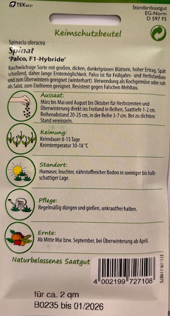 Der Spinat Palco ist eine Rraschwüchsige, spät schießende Sorte mit großen dicken, dunkelgrünen Blättern.