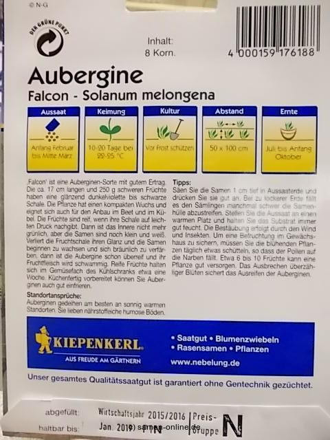 Falcon ist eine Auberginen Sorte mit sehr gutem Ertrag. Die 17 cm langen und 250g schweren Früchte haben eine glänzend dunkelviolette bis schwarze Schale.