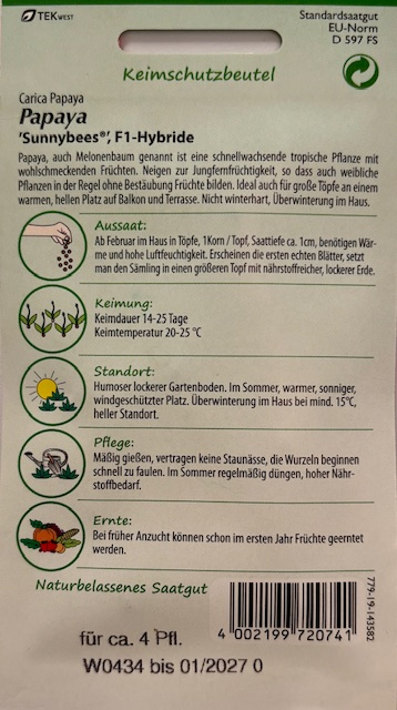 Papaya, auch Melonenbaum genannt, ist eine schnellwachsende tropische Pflanze mit wohlschmeckenden Früchten. Sie neigen zur Jungfernfrüchtigkeit, so dass weibliche Pflanzen in der Regel auch ohne Bestäubung Früchte tragen. Ideal für große Töpfe.NICHT Winterhart, Überwinterung im Haus!