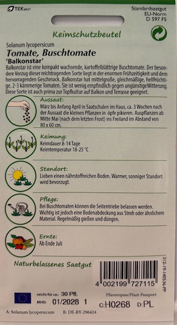 Balkonstar ist eine kompakt wachsende, Kartoffellaubige Buschtomate. Der besondere Vorzug dieser reichtragenden Sorte liegt in der enormen Frühzeitigkeit und dem hervorragenden Geschmack. Balkonstar hat mittelgroße Früchte und ist wenig empfindlich gegen ungünstige Witterung. Diese Sorte eignet sich prima für Balkone und TerassenInhalt reicht für ca. 30 Pflanzen