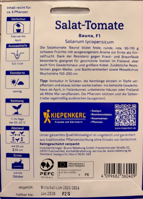 Die Salattomate 'Bauna' überzeugt mit festen, runden, roten Früchten, die zwischen 90-110 g wiegen und ein ausgewogenes Aroma bieten. Diese Sorte ist nicht nur schmackhaft, sondern auch resistent gegen Krankheiten, was sie ideal für den Anbau in geschützten Bereichen macht. Sie eignet sich hervorragend zur Ernte als Einzelfrucht und bringt frische Farben in Ihren Garten. Mit ihrem saftigen, knackigen Fruchtfleisch ist die 'Bauna' perfekt für frische Salate oder Sandwiches. Diese vielseitige Tomate kann auch gegrillt oder gefüllt genossen werden, was sie zu einer beliebten Wahl für jede Mahlzeit macht. Freuen Sie sich auf eine köstliche Ernte! Legen Sie jetzt den Grundstein für frische Aromen in Ihrer Küche!Inhalt reicht für ca. 6 Pflanzen