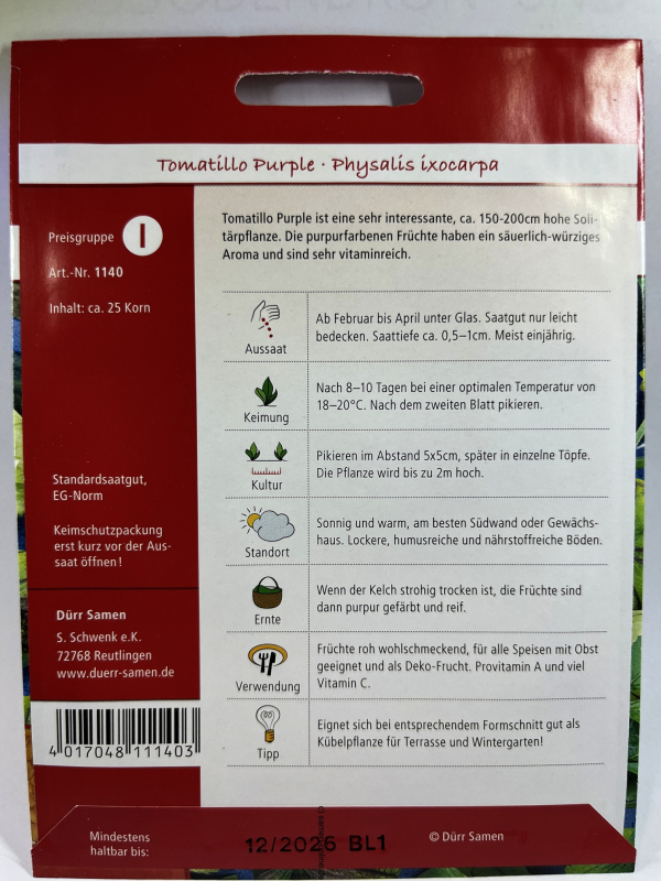 Tomatillo Purple ist eine sehr interessante, ca. 150-200cm hohe Solitärpflanze. Die purpurfarbenen Früchte haben ein säuerlich-würziges Aroma und sind sehr vitaminreich.Inhalt: ca. 25 Korn
