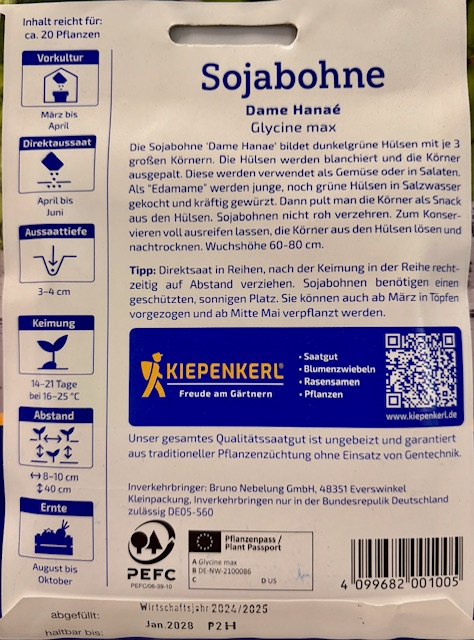 ie Sojabohne 'Dame Hanae' bildet dunkelgrüne Hülsen mit je 3 großen Körnern. Die Hülsen werden blanchiert und die Körner ausgelöst. Diese werden verwendet als Gemüse oder in Salaten. Als "Edamame" werden junge, noch grüne Hülsen in Salzwasser gekocht und kräftig gewürzt. Dann pult man die Körner als Snack aus den Hülsen. Sojabohnen nicht roh verzehren. Zum Konservieren voll ausreifen lassen, die Körner aus den Hülsen lösen und nachtrocknen. Wuchshöhe 60-80 cm. Das Wachstum dieser Bohne ist mühelos, was sie auch für Gärtner geeignet macht, die neu in diesem Bereich sind. Bringen Sie eine neue Dimension des Geschmacks in Ihre Küche mit der Sojabohne 'Dame Hanae'. Entdecken Sie die Vielfalt der Sojabohne in Ihrem Garten!Inhalt reicht für 20 Pflanzen