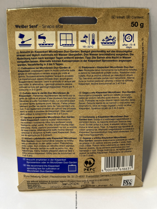 Senfsaat als Keimsprosse.Saatgut gleichmäßig auf das Anzucht Gitter streuen und täglich mehrmals mit Wasser übergießen. Das Wasser anschließend ausgießen. Die Abdeckung kann nach wenigen Tagen entfernt werden. Tipp: die Samen eine Nacht in Wasser vorquellen lassen. Verzehrfertig in 3 bis 5 Tagen.