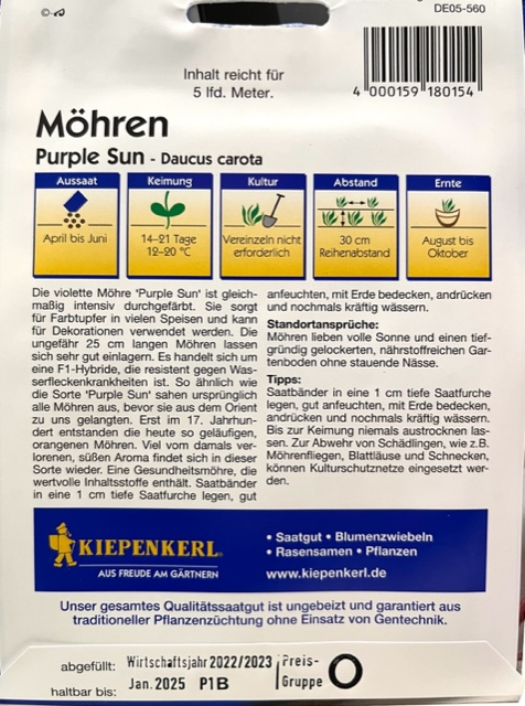 Die violette Möhre Purple Sun ist gleichmäßig intensiv durchgefärbt. Sie sorgt für Farbtupfer in vielen Speisen und kann für Dekorationen verwendet werden. Die ungefähr 25 Zentimeter langen Möhren lassen sich sehr gut einlagern. Es handelt sich um eine F1 Hybride Komma die resistent gegen wasserflecken Krankheiten ist . So ähnlich wie die Sorte Purple Sun sahen ursprünglich alle Möhren aus, bevor sie aus dem Orient zu uns gelangten.